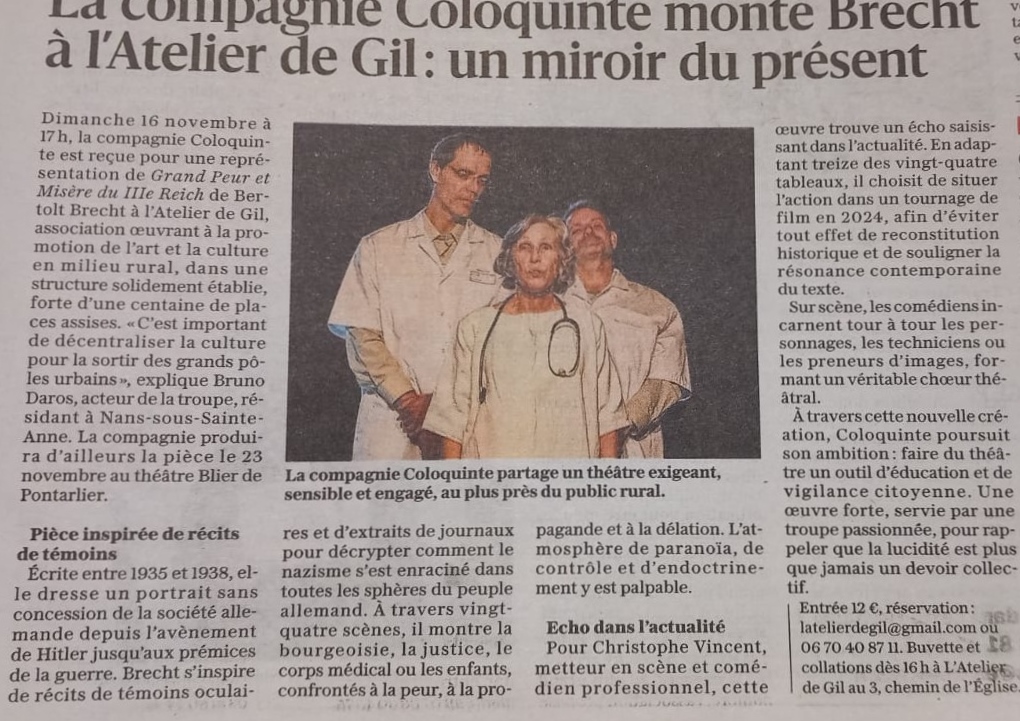 Pas d’ennui évidemment dans une salle pleine. Bonheur de retrouver comédiennes et comédiens de Coloquinte, amateurs affutés et bosseurs qui se font plaisir en jouant et nous incitent à être en connivence. Nous ont amusés tel ou tel clin d’œil au public dans la narration, la mise en scène, des allusions. Un peu, pas trop, juste ce qu’il faut pour détendre et faire que se joue la comédie.